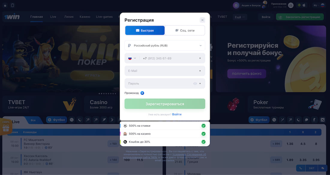 Онлайнказино 1 win предлагает два удобных способа регистрации: